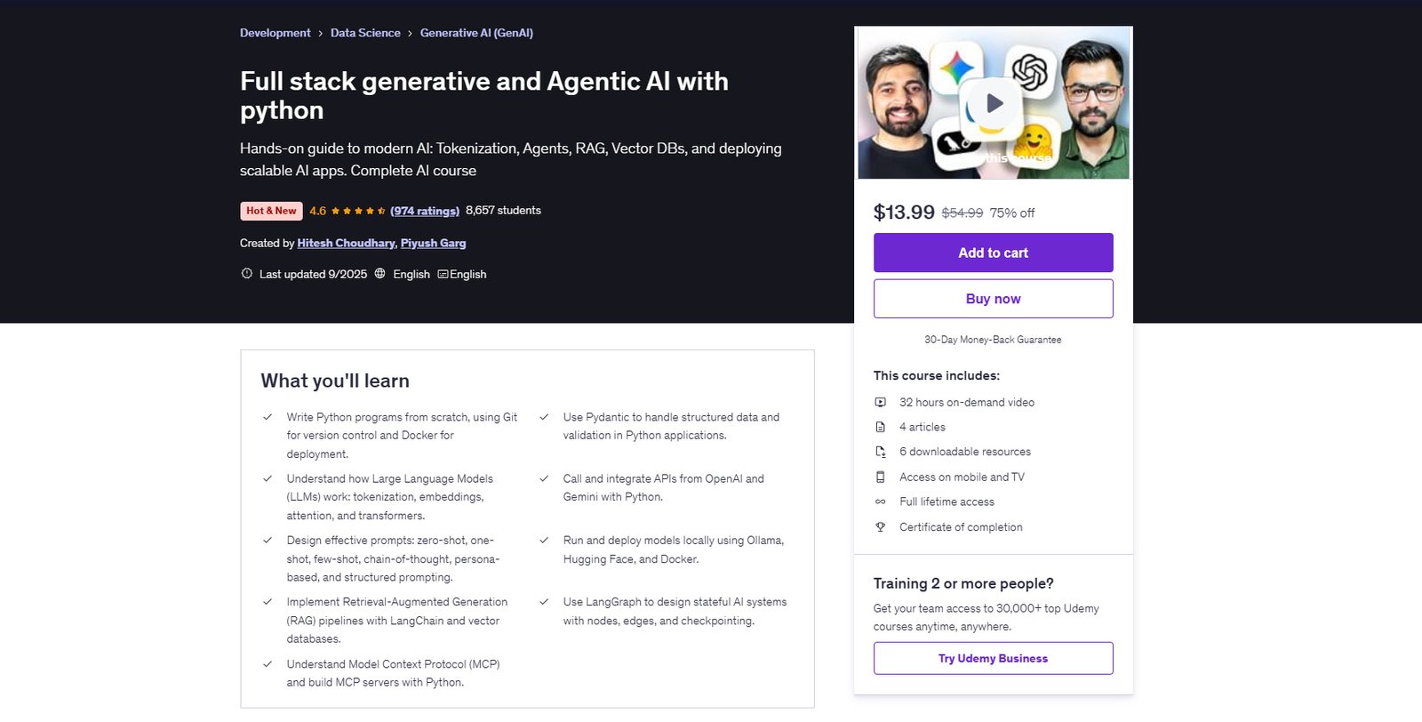 The “Full Stack Generative and Agentic AI with Python” course on Udemy, taught by industry experts Hitesh Choudhary and Piyush Garg, is designed to transform you from a coding novice or a traditional developer into a job-ready AI Engineer.